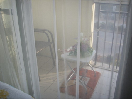 透過(guò)紗簾看小小的陽(yáng)臺(tái)