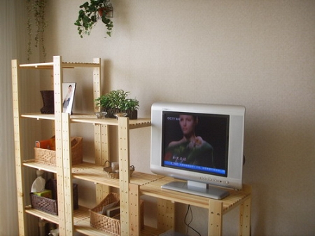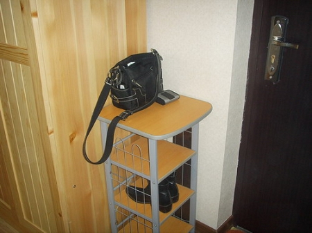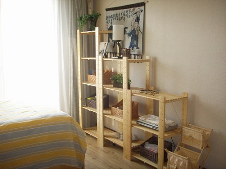 推門(mén)進(jìn)去,就是一個(gè)小鞋架子,干凈整潔,進(jìn)門(mén)的小地兒。房間雖小,還是要把它整得整齊點(diǎn),為了門(mén)口換鞋和放雜物的需要,把大衣柜搬到這兒和這個(gè)假子一起組成一個(gè)小小玄關(guān)。