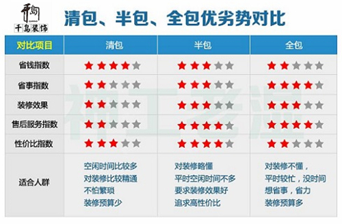 裝修前首先要搞清楚幾個(gè)裝修形式的概念,清包、半包、全包還有現(xiàn)在的主流整裝概念。每件事都各有它的兩面或者多面性,利或弊,好或壞。清包很省錢(qián),全包很省力,半包則介于兩者之間,這也是為什么很多人會(huì)選擇半包的主要原因。