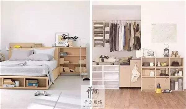 白色和原木色作為房間的基調(diào),并用統(tǒng)一規(guī)格的收納柜收納物品,空間呈現(xiàn)出一種干凈、素潔、寬敞的感覺(jué)。
