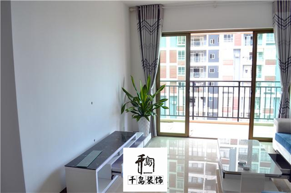 客廳的墻面就是刷大白,沒有其它的裝飾;地面是普通的大地磚;陽臺是開放式的陽臺,安裝了一個玻璃推拉門。下面是客廳的整體效果。