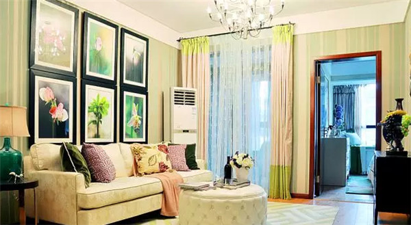 把自己的攝影作品加入自家的墻面裝飾,以花為主題,貫穿家的整體搭配,經(jīng)濟又獨特.墻紙的顏色跟窗簾地毯進行呼應,一個綠意濃濃的客廳溫馨又舒適。